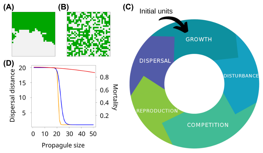 Figure 1. (A) Example of Aggregated landscape, where green and gray patches represent high and low quality patches, respectively; (B) example of Random landscape. (C) Flow diagram of the model. Units (simulated organisms) are introduced in the simulation; units grow; a stochastic extinction probability is applied to each patch; in occupied patches, competition leads to extinction of all but one unit; if their size is higher than their investment threshold, they reproduce (if not, they remain in the patch waiting for the growth phase); when units reproduce, their offspring can be mutants regarding investment and/or propagule size; propagules disperse and land on occupied or empty patches. (D) Curves for the dispersal distance with strong (yellow) and weak (red) size–dispersal tradeoff, and dispersal mortality (blue) as a function of propagule size.